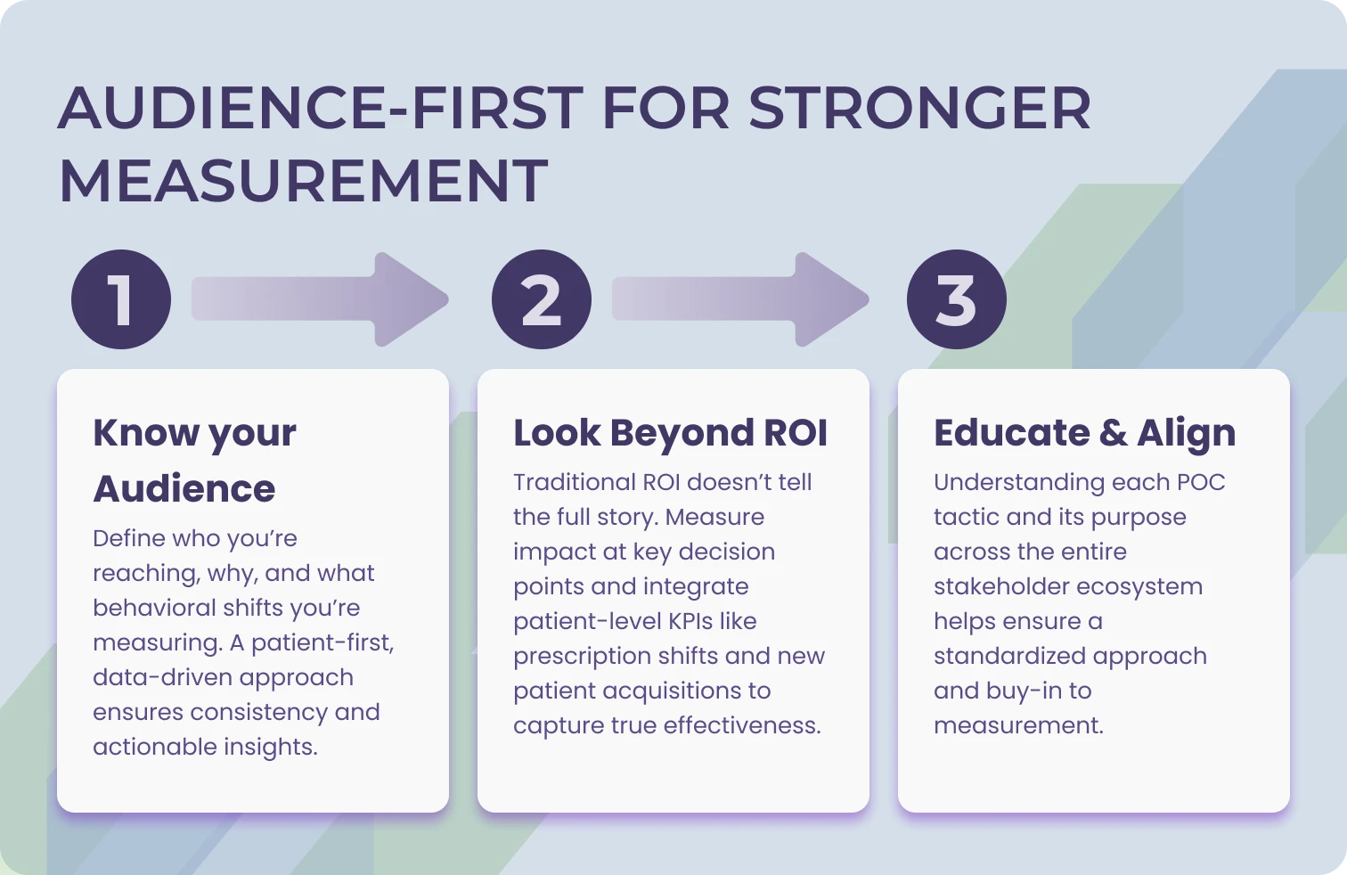 The primary value of measurement isn’t simply validating channel effectiveness but identifying optimization opportunities, which truly benefit HCPs and patients. Data is a gift to marketers, establishing how and what people respond to. In an interconnected digital environment, this is very important since no touchpoint truly stands on its own. By accurately measuring POC within a multi-channel marketing strategy, we accomplish several critical objectives: