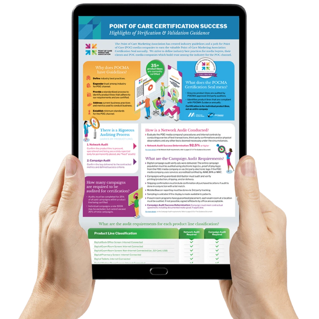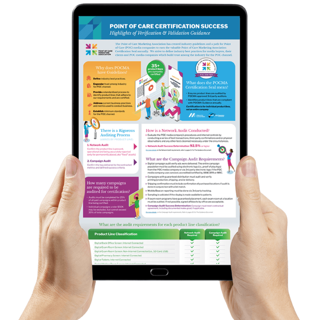 One of our goals at the Point of Care Marketing Association (POCMA) is to establish verification and validation guidelines to build trust among all who utilize and purchase media at the point of care. As part of this duty, POCMA also provides annual certification seals for POC media providers that meet these guidelines for their individual media tactics as verified by one of POCMA’s approved third-party auditors. This rigorous process helps buyers identify which product lines have met the standards, providing greater confidence in their ability to deliver each campaign to their target audience.
